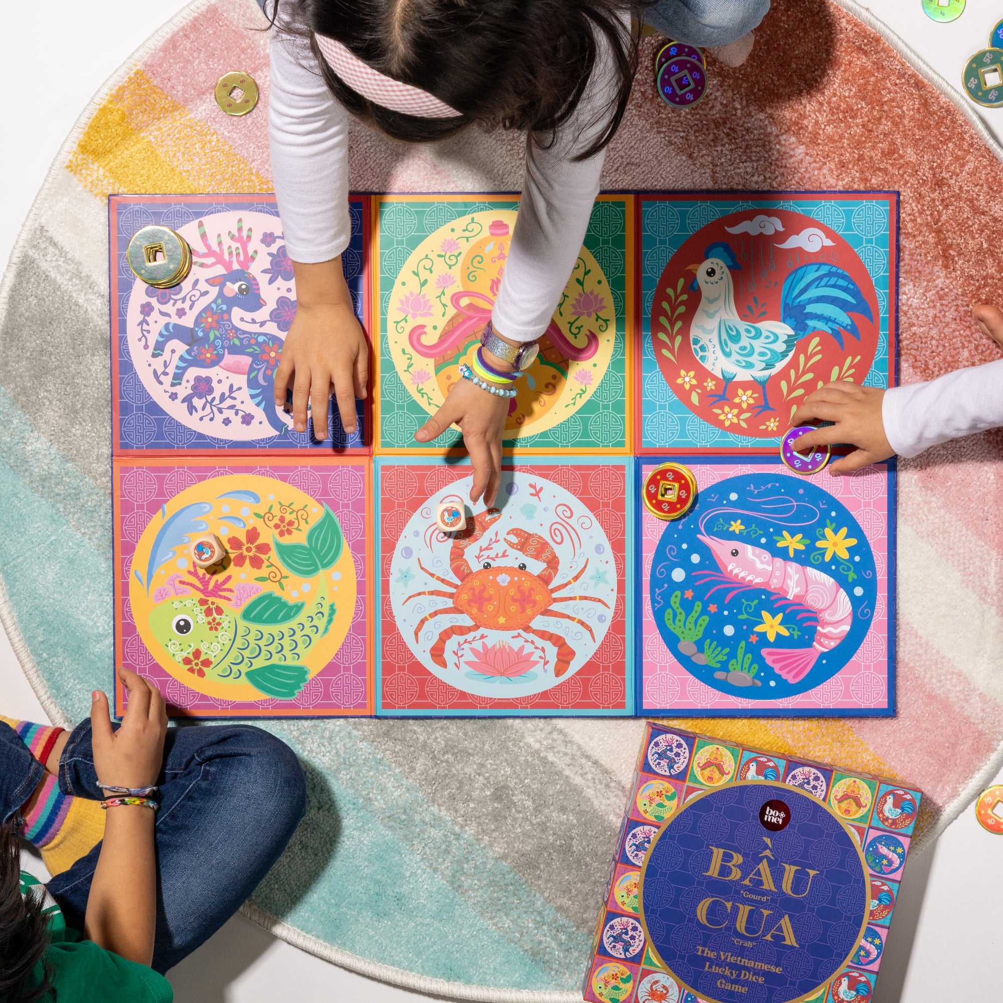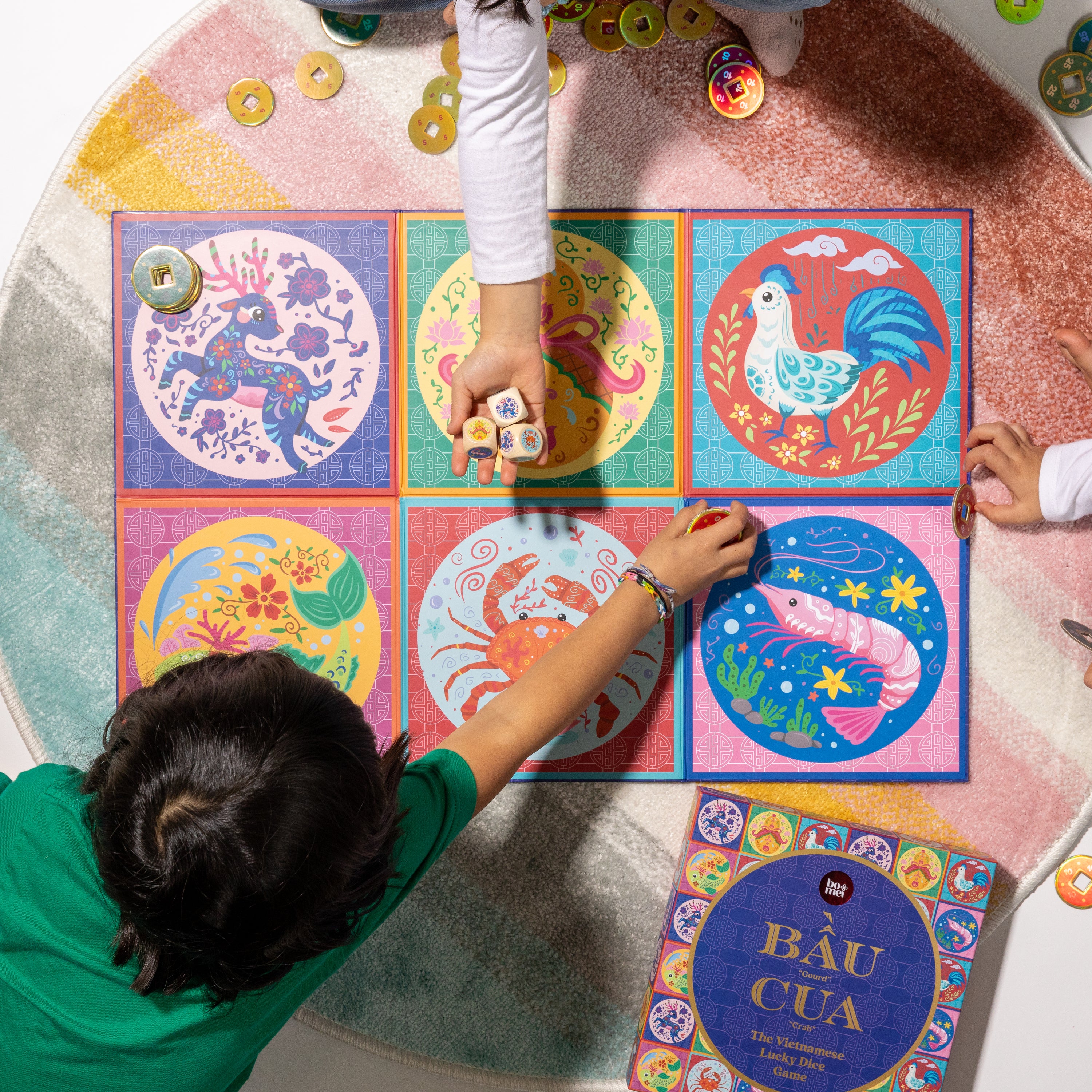 Celebrate Vietnamese heritage with Bầu Cua, a beloved family game of luck and tradition! We've upgraded our 1st edition set to include the same highly reviewed features—a beautifully illustrated, large, durable game board + 3 large wooden dice—and added more tokens with 3 different values for enhanced play.