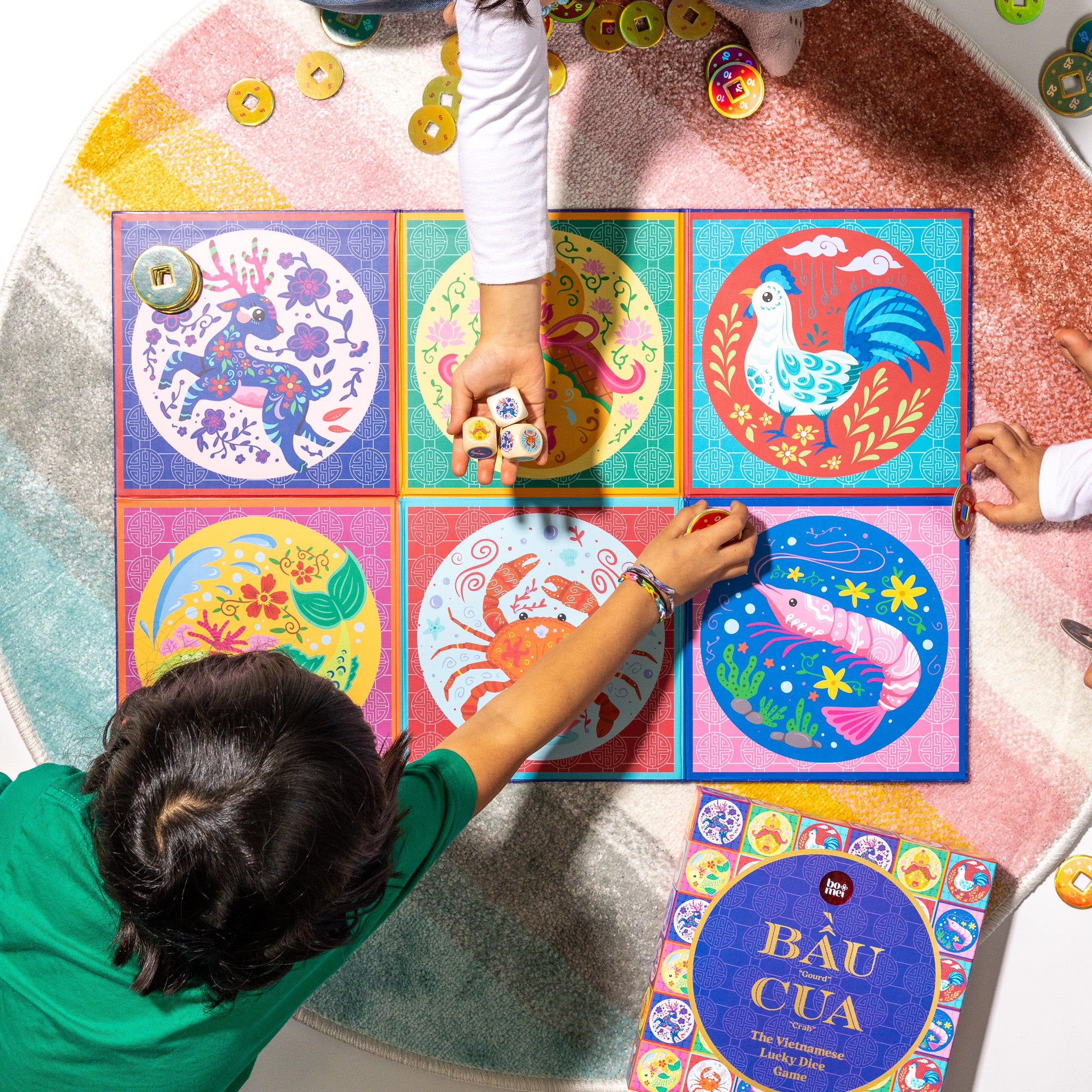 Celebrate Vietnamese heritage with Bầu Cua, a beloved family game of luck and tradition! We've upgraded our 1st edition set to include the same highly reviewed features—a beautifully illustrated, large, durable game board + 3 large wooden dice—and added more tokens with 3 different values for enhanced play.